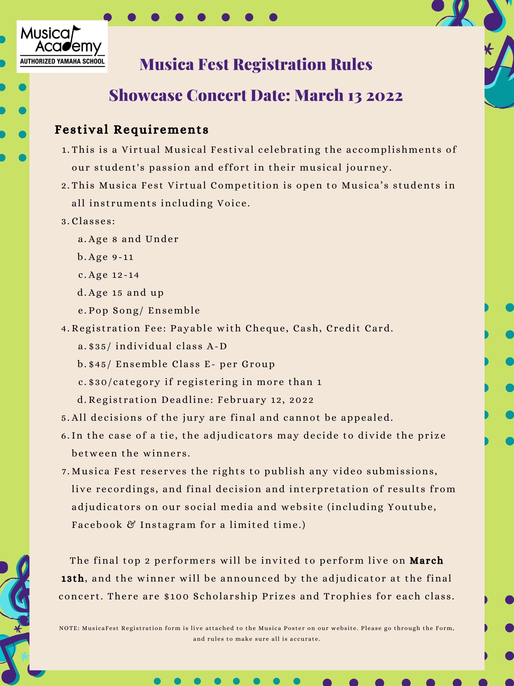 Musica Fest is an annual event where Musica Academy students of all ages and abilities are able to perform for a chance to win scholarships and prizes. This event provides a great oppourtunity for students to receieve comprehensive feedback from seasoned professionals, as well as offering a chance for students to learn more about the art of performance. To participate, performers can submit up to two video recordings of their pieces to be assessed by adjudicators.